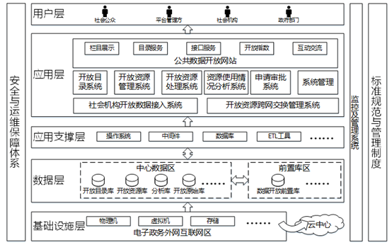四、基础设施层:由政务外网(互联网区)、服务器、存储备份、安全防护、安全认证、系统软硬件、机房环境等内容组成,承担着为省(市)公共数据开放网站给予网络、计算、存储、备份、安全防护、认证、交换等服务的重要职责。