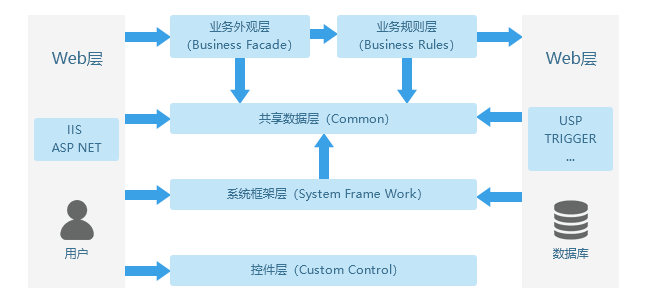 应急管理系统采用B/S(Browser/Server)架构,其关系如上图所示。根据.NET环境下Web应用开发的特点,并结合用户需求,安全生产监督管理服务中心网站及其业务系统的开发将采用如图3所示的系统结构,将一个Web应用划分为Web层、业务外观层、业务规则层、数据访问层、Common层、System Frame Work层和自定义控件层。其中,Web层定义用户界面和操作界面逻辑控制;业务外观层(Business Facade)将用户界面和各种业务规则隔离开,为Web层给予调用接口;业务规则层(Business Rules)定义业务逻辑和规则;数据访问层(Data Access)定义各种数据访问逻辑,控制数据的访问模式;Common层为Web层、业务层和数据访问层给予公共性服务;System Frame Work层定义系统信息,为Web层和数据访问层给予服务;自定义控件层(Custom Control)为Web应用所用到的自定义控件。用户顺利获得Web浏览器与Web层交互,Web层调用业务外观层,业务外观层调用业务逻辑层的服务,业务逻辑层又调用数据访问层的服务,最后,数据访问层调用数据层的服务。