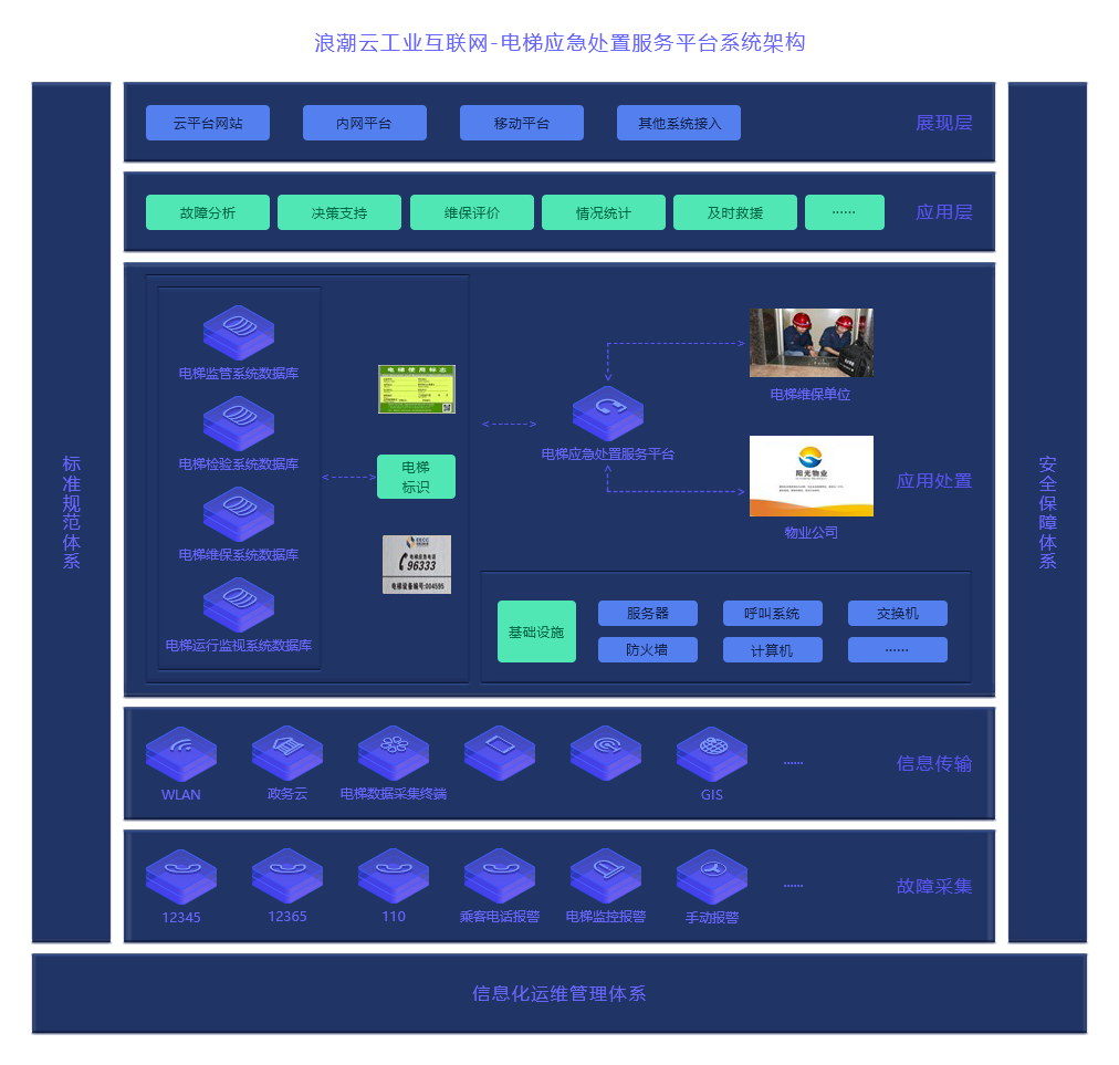 电梯应急处置服务平台的建设运行,为召开标准的制定工作奠定了基础,顺利获得运用平台运行总结的经验,为实现标准化的手段给予了有利支撑。特别是山东省强制地方标准《电梯标志和标识》(DB37/2604-2014)、山东省推荐性地方标准《电梯更新、改造、修理技术评价规则》(DB37/T 2645-2015)等标准都源于电梯应急处置服务平台建设带来的良好效应和促进作用 将系统平台可依托公有云、政务云、私有云等云平台建设,给予可靠地基础 IT 服务平台,有利于信息的互联互通,避免产生“信息孤岛”,并且安全稳定,有助于使用、监管、指挥调度、维保单位在电梯使用、维护、救援等工作方面落实主体责任将系统平台的软件集成到政务云,为其给予了相对安全稳定的环境。把传统的政务应用转移至平台,给予可靠地基础 IT 服务平台,有利于信息的互联互通,避免产生“信息孤岛”,并且安全稳定。96333 作为电梯的应急处置服务平台,有且相对稳定安全的环境,才能更好的发挥其效用,着力使维保单位在信息数据、维保工作等方面落实维保单位的主体责任 应用层给予故障分析、决策支持、维保评价、情况统计、及时救援等应用功能 电梯应急处置服务平台基于基础设施(服务器、呼叫系统、交换机、防火墙、电脑)进行建设,建设电梯应急处置中心,与电梯维保单位、物业公司建立快速联接,顺利获得电梯标志标识,对电梯维保信息、综合信息进行管理,并对电梯应急情况进行处置。移动APP端可进行移动应急处置,电梯维保情况也可进行移动端记录查询 基于本平台的建设,电梯信息及相关采集数据顺利获得网络进行传输。平台搭建具有完善的标准规范体系、安全保障体系及运维管理体系,以保障信息传输和故障采集的过程安全 应用层给予故障分析、决策支持、维保评价、情况统计、及时救援等应用功能 电梯应急处置服务平台基于基础设施(服务器、呼叫系统、交换机、防火墙、电脑)进行建设,建设电梯应急处置中心,与电梯维保单位、物业公司建立快速联接,顺利获得电梯标志标识,对电梯维保信息、综合信息进行管理,并对电梯应急情况进行处置。移动APP端可进行移动应急处置,电梯维保情况也可进行移动端记录查询 基于本平台的建设,电梯信息及相关采集数据顺利获得网络进行传输。平台搭建具有完善的标准规范体系、安全保障体系及运维管理体系,以保障信息传输和故障采集的过程安全