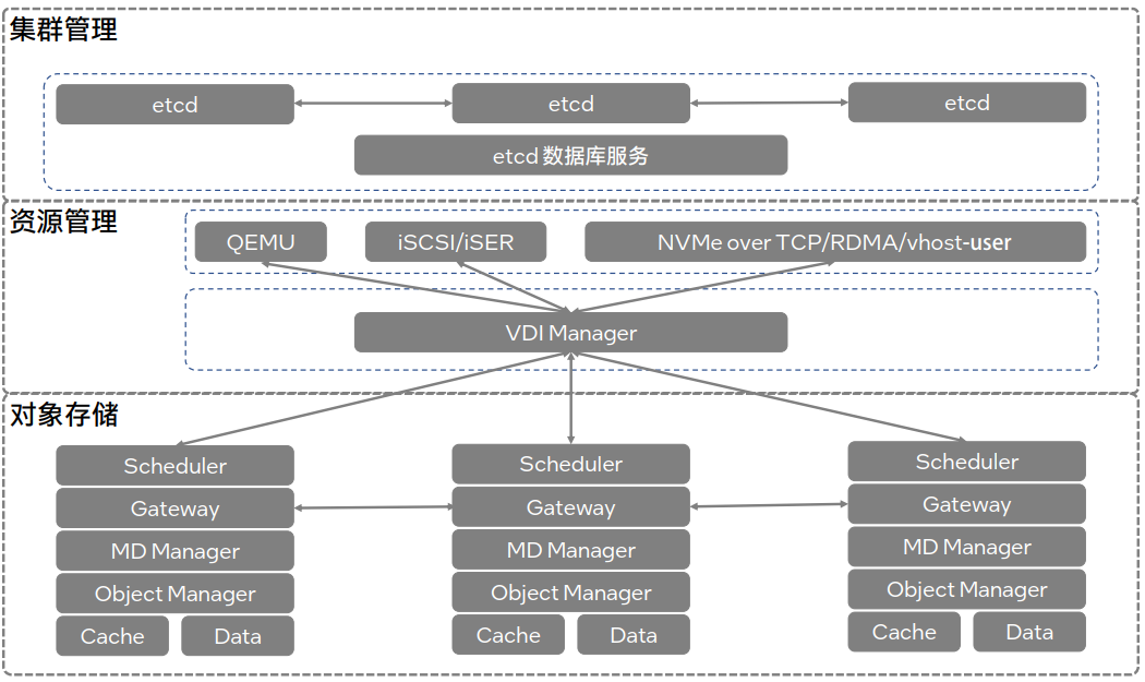 作为新一代超融合解决方案, ■澳门十大棋牌排行榜最新■云海® 超融合一体机 InCloud Rail 顺利获得软件定义的计算、存储和网络技术实现了服务器的资源池化,使整个 IT 环境比单独的物理硬件具有更高的可用性、安全性和扩展性,能够有效满足企业对于降低成本、简化管理、提高安全性和扩展性的需求,助力企业向云计算迁移核心业务,构建企业云数据中心。 ■澳门十大棋牌排行榜最新■云海® 超融合一体机 InCloud Rail 实现了存储资源的池化和统一管理,并顺利获得全闪存架构的软件定义存储 SmartONE 支持异构算力的融合。SmartONE 采用 etcd 组件作为集群管理,负责分布式存储的节点的关系、节点之间的元数据传递及一致性等。在资源管理方面,SmartONE 给予了 qemu、iSCSI 和NVMe-oF 的服务入口,对接 VDI 卷管理入口,对外给予存储资源。在对象存储方面,SmartONE 主要接收 VDI 的 IO 请求,根据数据分布算法调度到相关节点,根据副本策略和 EC 规则调用 Gateway 分发到分布式存储的存储节点。